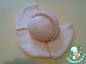 На кружочке бОльшего размера делаем 4 надреза и в середину кладем шарик с джемом.