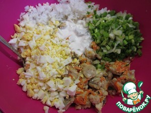 Соединить вместе морковку с рыбкой, рис, яйца, зеленый лук, соус чили, каперсы и оставшиеся сливки.