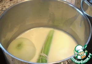 Поэтому – ставим молоко на огонь заранее, кладём туда корнеплоды, травы и прочие хахаряшки и лишь затем начинаем готовить ру. Когда понадобится молоко, оно уже будет ароматным.