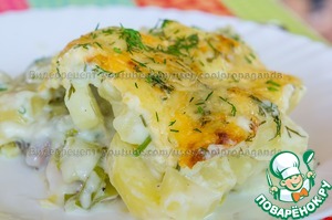 В форму для запекания выложу слой сырой рыбы, приправлю солью/перцем, слой обжаренного порея, немного бешамеля, затем выложу картошку, присыплю её порубленным укропом, залью бешамелем и завершу натертым сыром.