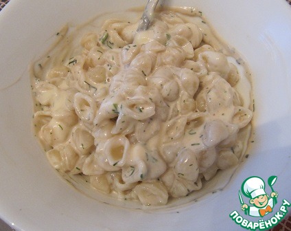 Смешиваем сметанку с мелко нарубленным сыром. добавляем соевый соус. перемешиваем, добавляем укроп, перемешиваем и добавляем соус к горячим рожками. Cоус просочится через рожки, а сыр начнет таять... мммм...