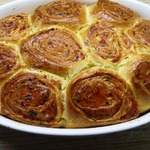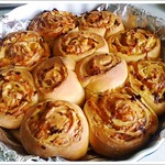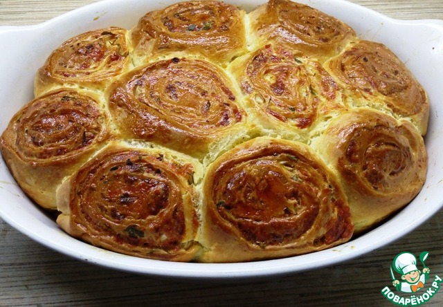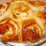 Тесто раскатать в тонкий пласт и выложить начинку. Свернуть в рулет, и разрезать на порционные кусочки.