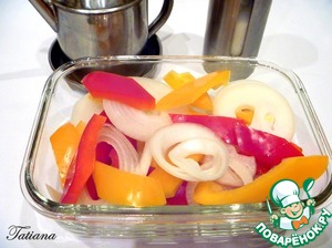 Крупно нарежьте лук и сладкий перец, немного посолите, добавьте пару столовых ложек масла.