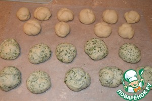Обычное тесто и тесто со специями разделить на 10 частей и скатать их в шарики. Накрыть полотенцем и дать постоять 15 минут.