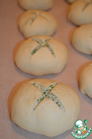 Противень застелить пергаментом и выложить на него шарики швом вниз. Сверху сделать крестообразные надрезы. Накрыть полотенцем и оставить на 30-40 минут.