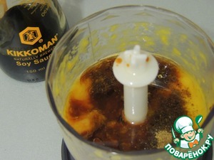 Добавить кетчуп, соевый соус Kikkoman, масло, мёд, соль и перец.