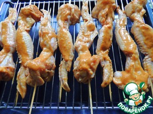 Надеть крылья на шпажки (предварительно замочить шпажки в воде на 30 минут). Выложить на решётку и запечь в духовке при 190* 25 минут перевернув 1 раз на другой бочок.