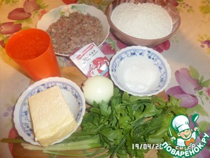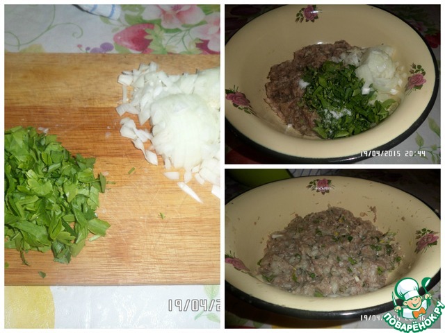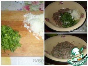 Нарезаем лук и зелень. Добавляем к фаршу. Солим, перчим по вкусу. Хорошо перемешиваем.