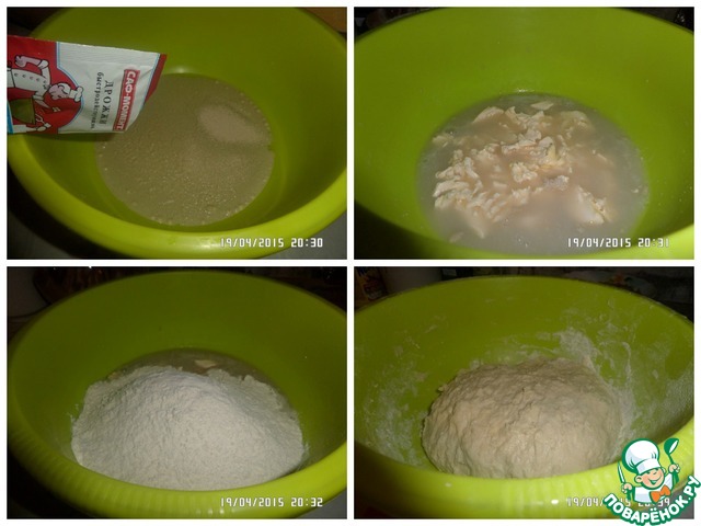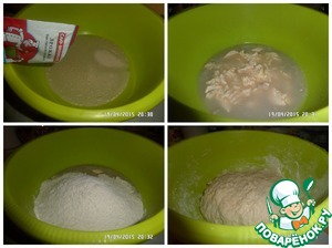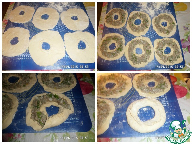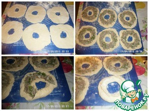 На рабочей поверхности раскатываем из нашего теста лепешки, в центре которых делаем отверстие. По кругу выкладываем начинку. Защипываем по кругу.