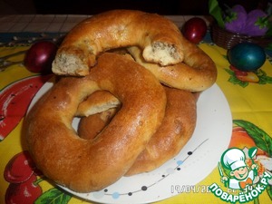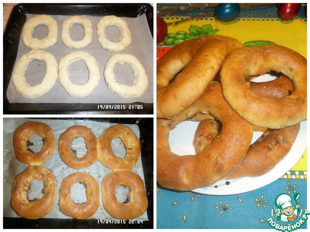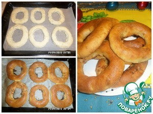 Выкладываем наши баранки на противень, застеленный пергаментом, швом вниз. Даем постоять в теплом месте под полотенцем минут 20. Выпекаем при 150-180 градусах 40-45 минут. За 10 минут до окончания выпечки смазываем желтком.