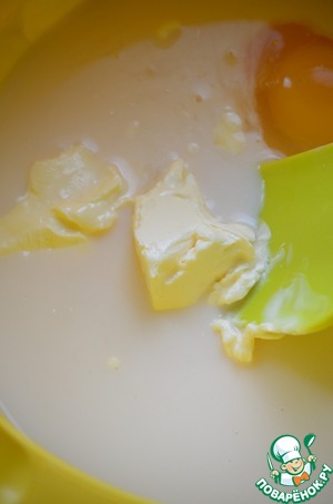 • Добавить молоко, пряности, яйцо, маргарин, соль,1,5 ст муки. Тщательно взбить смесь миксером. Тесто должно получиться, как густая сметана.