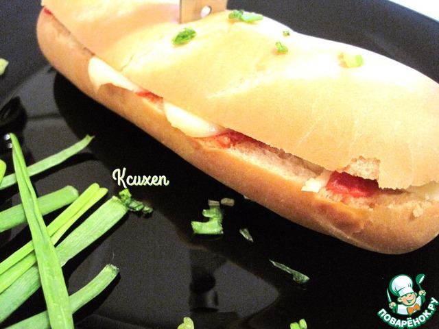 Вынимаем противень из духовки, закрываем багеты "крышечкой" и плотно прижимаем, что б соус пропитал верхнюю часть. Подаём сэндвич горячим.