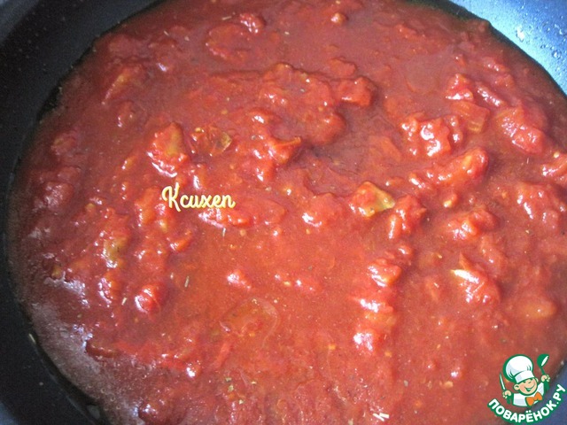 В сковороду, где жарились фрикадельки, добавим томаты в собственном соку, 1 чайную ложку чесночного порожка, базилик, красный перец и разбавим смесь соевым соусом Kikkoman.