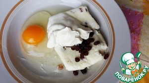 Готовим начинку: к творогу добавить сметану, яйцо, изюм и хорошенько перемешать