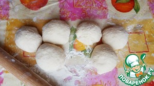 Подошедщее тесто выкладываем на стол, посыпанный мукой, и делим на 6 ровных частей