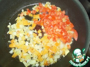 Затем добавить перец и помидор нарезанные кубиками. Всё вместе обжарить.