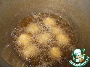 Далее из рыбного филе, делаем небольшие шарики, обваляем их в панировочных сухарях.