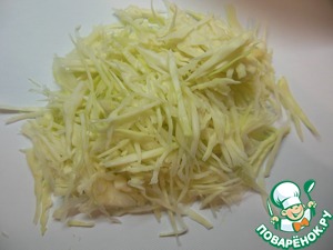 Капусту тоненько нарезаем. Солим, и немного мнём руками. Она пустит свой сок.