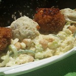 [+5]без фрикаделек-просто вкусно,салат был как будто 2-х мерный,чего-то не хватало ,и казалось что желток в соусе был слишком доминантным.поэтому я и не украшала яйцом,потому что было-бы уже "ту мач".а вот с фрикадэльками-очень вкусно,они расставили все акценты на свои места, и пришла гармония.