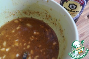 Лук превратить в кашицу при помощи блендера, можно натереть на терке. Чеснок пропустить через пресс. К смеси апельсинового сока и соевого соуса добавить кашицу из лука, чеснок, мед (если густой, то предварительно растопить его), горчицу, солим, перчим и приправляем специями. Хорошо перемешиваем.