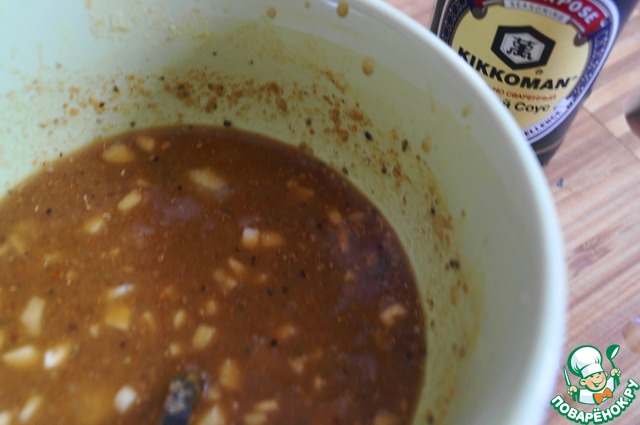 Для маринада-глазури: апельсиновый сок смешать с соевым соусом. -