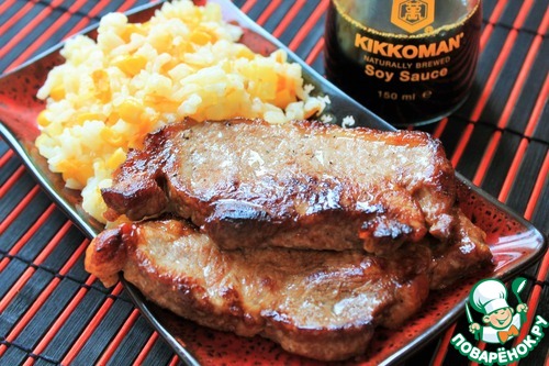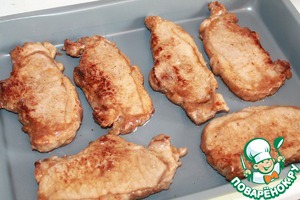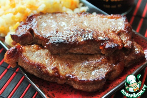 Обжариваем мясо с двух сторон на сильном огне. Выкладываем на противень и отправляем на 10 мин. в разогретую до 200 гр. духовку. Наше мясо готово. Оно очень вкусное и сочное.