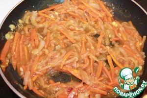 Обжариваем лук и морковь, до мягкости лука. Морковь должна быть немного хрустящей.