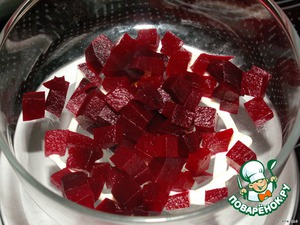Варeную свеклу и картофель порезать маленькими кубиками.