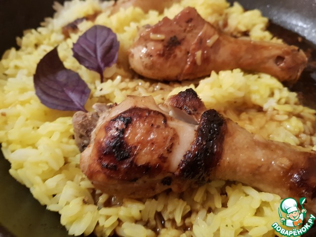 Рис промыть, засыпать в сковородку к окорочкам и залить бульоном, посыпать мелко нарубленной зеленью, посолить, поперчить. Тушить под крышкой на слабом огне 15 минут. Потом еще 10 минут дать рису набухнуть.