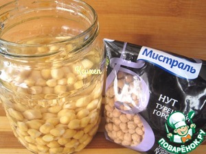 Нута я брала много для приготовления горячего блюда, поэтому сколько конкретно для майонеза понадобилось сухого гороха не скажу. Примерно пару горстей. Нут замачиваем на ночь в холодной питьевой воде в пропорции 1:4