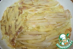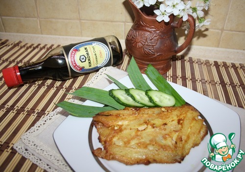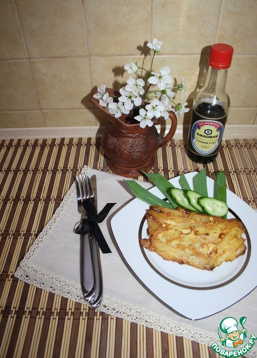 Затем нужно "прилепить" картофельную стружку (картофель очистить и нарезать тоненькой лапшой) с двух сторон. Это не слишком просто, поэтому действовать нужно аккуратно. В следующий раз попробую нарезать стружку помельче - надеюсь будет немного удобней. Итак, обжариваем с двух сторон отбивнушечки в разогретом подсолнечном масле на среднем огне до золотистого цвета. Подавать сразу!