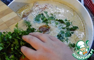Петрушку моем и мелко нарезаем, немного откладываем для подачи. К мясу вливаем сливки, добавляем шафран, доводим до кипения при постоянном помешивании. Добавляем петрушку, перемешиваем, накрываем крышкой или фольгой и убираем в разогретую духовку на 1 час.
