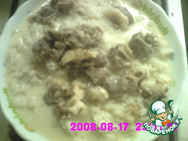 • Выкладываем сверху рис и заливаем половиной йогуртно - мясной основой вместе с мясом. Остальную основу выливаем в глубокую тарелку.