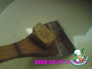 • В глубокую тарелку нарываем лаваш или булку кусочками 2*2 или 3*3 см.