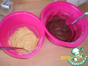 Миксером взбить сливочное масло, ванилин и сахар. Постепенно добавить яйца. Муку смешать с разрыхлителем и тоже перемешать с массой. Полученное тесто разделить на две части, в одну добавить какао и молоко, перемешать.