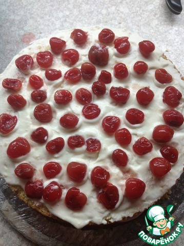 Кладем второй корж, обильно смазываем его масляным кремом, выкладываем "пьяную" вишню"