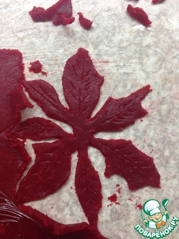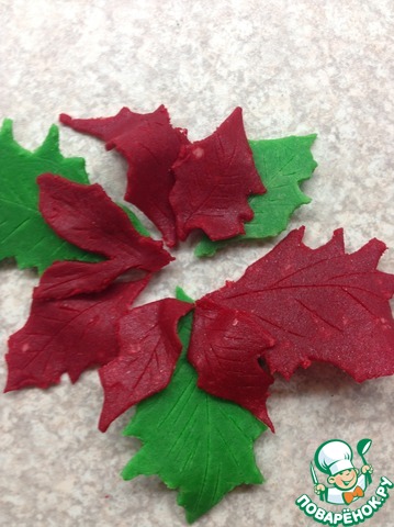Подкрашиваем марципан зеленым и красным пищевыми красителями (маленький кусочек красного марципана оставляем в холодильнике в пищевой пленке). тонко раскатываем. И по шаблону вырезаем листочки: