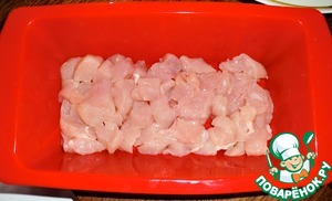 Форму я смазала растительным маслом (самую малость), куриное филе нарезала небольшими кубиками.