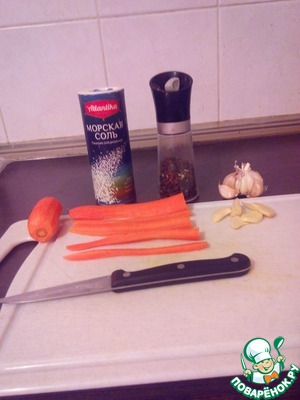 Куриную грудку моем. Морковь помыть, разрезать пополам вдоль, затем каждую половинку режем на 6 длинных полосок. Чеснок чистим и режем на 2-3 дольки (в зависимости от размера).