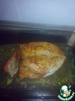 Ножом протыкаем курицу в некоторых местах и шпигуем её морковью и чесноком (чеснок и морковь вместе в каждый разрез). Натираем куриную грудку солью и перцем. В стеклянную посуду наливаем 150 мл. воды, кладем куриную грудку. Воду немного посолить и поперчить.