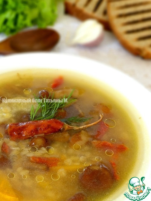 Похлебка с чечевицей, чили и опятами на курином бульоне - остренькое первое блюдо согреет вас в прохладный и ненастный день, если весна никак не наступает и не радует своим теплом) и поднимет настроение своей яркостью!