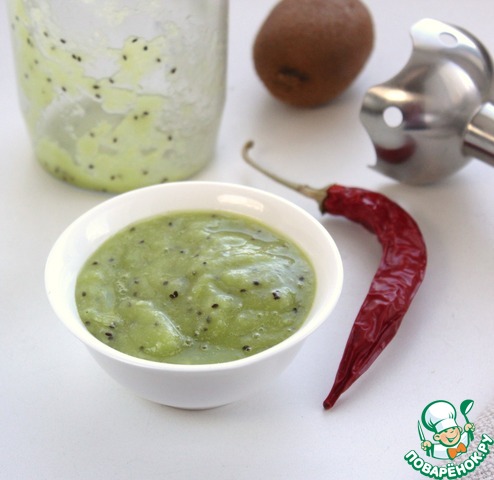 Киви и чеснок очистить, нарезать, добавить половину нарезанного стручка перца чили