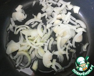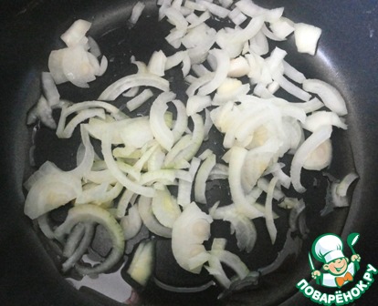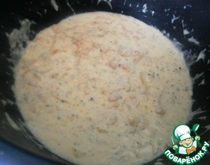 лук обжарить на смеси сливочного и растительного масла до золотистости, добавить 2ст. л. муки, перемешать, добавить сметану, воду, перемешать чтобы не было комочков. Ввести половину сыра, натертого на мелкой терке, добавить соль, специи по вкусу. -