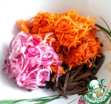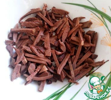 Сердце отварить (я делала это в мульти-скороварке 40 минут), остудить, нарезать соломкой.