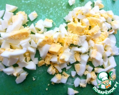 Яйца отварить, остудить, почистить, нарезать кубиком.