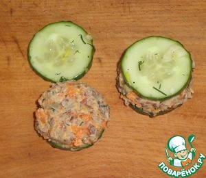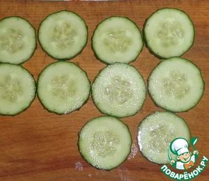 Достаем огурцы. На один кружочек кладем начинку и накрываем другим кружочками.