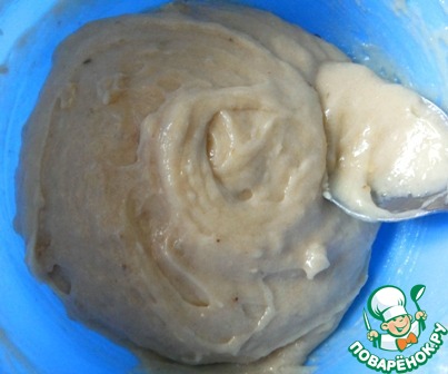 Банан размять немного (мелкие кусочки пусть остаются), добавить растительное масло, сахар и взбить миксером.