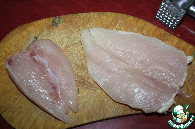 Филе куриное разрезать вдоль на 2 части. Затем каждый кусочек еще вдоль на 2 части, не дорезая до конца, раскрыть "книжечкой".