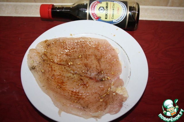 Отбить слегка каждый кусочек мяса, накрыв его пищевой пленкой. Намазать курочку перцем, чесноком, соевым соусом. Оставить для маринования минут на 20.