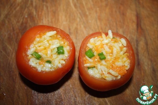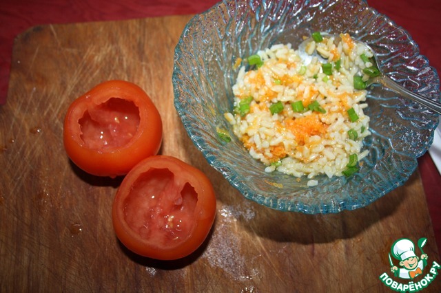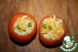 Рис отварить до полу готовности. Я брала бурый. Подойдет любой, который не развалится. Морковь потереть на мелкой терке и обжарить на растительном масле. Лук мелко порезать. У помидоров вырезать серединку, удалив всю жидкость.